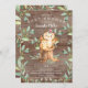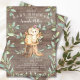 Cute baby shower invitation featuring sweet baby owl with mum sitting on a tree stump and framed with natural green watercolor leaves set on a rustic wood background. Flip our invite over to view a matching green leaf back for an extra special touch..