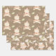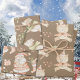 A baby's first Christmas holiday gift wrapping paper featuring watercolor-painted teddy bears, a baby fox flying through the air, and Santa holding the baby in a trio sheet set on a kraft colour background.