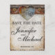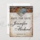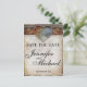 So many subtle details can be seen on this wedding save teh date postcard. From a wood background that holds lace embellished burlap texture. From the aged metal heart in the centre with a barn illustration in the middle of it and faux diamonds. Faux metal flowers, grommets and buttons adorn the top leather piece as well as flourish elements. Elegant and fun typography is placed atop the burlap texture on both the Wedding Invitation & RSVP. Prints well on any card stock!