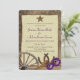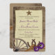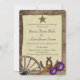 Antique wagon wheel and rustic country barn wood "tie the knot" rope and horseshoes design invitation with western antiqued star and purple gerbera daisy flowers.