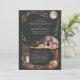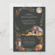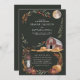 This rustic wedding invitation captures the charm of an autumn evening with a cosy barn, hay bales, and a vintage lantern under the soft glow of a full moon. Framed by warm autumnal leaves, the deep green background accentuates the rich earthy tones, creating a serene and inviting atmosphere perfect for a countryside wedding. This design is ideal for couples seeking a romantic, rustic theme for their special day.