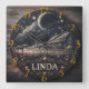 A beautifully crafted wood piece showcases a barn under a starry sky, featuring a horse, moon, and celestial elements. The name Linda is prominently displayed.