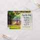 This Save the Date wedding announcement features a rustic barn with a patriotic American flag in a charming wooded country setting.