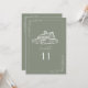Illustration of rustic barn at top with line art botanical border. Background is Sage Green colour.