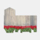 Favour box featuring a rustic weathered barn wall, fronted with bright red tulips.
