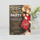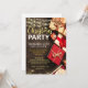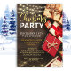 Elegant and rustic Christmas party invitation with sparkly string lights and wrapped gifts on a barn wood background.