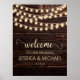 Wedding welcome banner / sign with a rustic barn wood design with string lights.