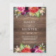 This charming rustic wedding invitation has a rich barn wood background with colourful floral accents framing the text. The colours are rich and lovely with russet salmon, deep pink and burgundy roses and mixed wildflowers and greenery. The look is simply perfect for a barn or rural estate or ranch wedding, a rustic boho style wedding, or a country western themed wedding. Personalise the text with your details.