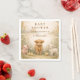 A charming countryside design featuring a fluffy calf, a sweet little lamb, and tiny yellow chicks nestled among soft meadow wildflowers. The warm parchment background and muted earth tones create a cosy, rustic atmosphere with a gentle storybook feel. Delicate greenery frames the layout while the farm animal illustration adds warmth and personality. Perfect for a neutral rural-themed celebration with classic farmhouse charm.