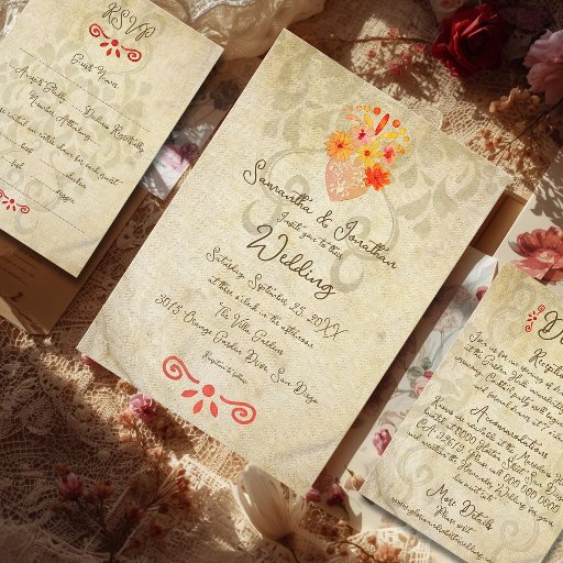 Rustic Baroque Floral Wedding RSVP Design captures the warmth and authenticity of Mexican artistry with a soft, vintage aesthetic. This wedding RSVP card features a delicate beige linen background textured to resemble natural woven fabric, creating an inviting and organic look. Subtle Baroque-inspired floral scrolls are faintly embossed across the surface, while small folk-art flourishes in deep red add a handcrafted touch reminiscent of traditional Mexican textile embroidery.
