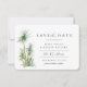 Rustic watercolor island palm trees, Save the Date Card. Elegant and modern typography design. Backing colour, shown in sage green, can be customised.
