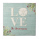 A beach themed ceramic tile with the word love, and personalised with your name underneath. A sand dollar seashell creates the "o" in the word love. This coaster has a weathered textured wood background and the corners are decorated with sea grasses. This sand dollar ceramic tile is a great addition to your beach decor, and also makes a great gift. Designed for you by Blackberry Boulevard.