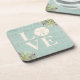A beach themed drink coaster with the word love. A sand dollar seashell creates the "o" in the word love. This coaster has a weathered textured wood background and the corners are decorated with sea grasses. This sand dollar plastic coaster is a great addition to your beach decor, and also makes a great gift. Designed for you by Blackberry Boulevard.