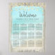 Easily help your guests find their seat with this poster wedding seating chart, featuring a beautiful aqua beach background framed with rustic weathered wood, with string lights at the top.