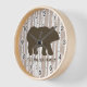A brown bear placed over birch trees with a neutral colour palette. This rustic clock would look great in any cabin, log home, or rustic themed room.