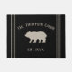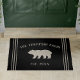 Welcome guests to your abode with this charming rustic farmhouse style doormat that's perfect for your cabin or country house. Personalised design features your family name in neutral tan lettering, along with your year established and a bear illustration. Rope stripe detailing on a rich black background completes the design.
