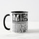 This mug features a black and white photo of distressed wood and windows along with customisable initial and message on front and back.