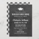 "Backyard BBQ" party invitation features a graduation cap motif, stylish custom text in western and modern fonts, a scroll and stripe design elements, and a white handwritten chalk look on a background with a rustic textured black chalkboard appearance. Perfect for a casual outdoor summer graduation party.