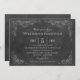 This formal wedding shower invitation card with a vintage wine label style design. Rustic hand-drawn chalk look sketches of grapevine leaves frame the important details. A simple flourished design with the event date appears on the reverse side. Soft white / grey on a black chalkboard style background with textured appearance.