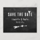 Custom rustic chalkboard wedding save the date postcards featuring wedding details, heart and arrow on a black chalkboard background.