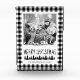 This rustic design features the words "Merry Christmas" in whimsical hand-printing font above a row of black and white pine trees. Personalise it with your family's holiday photo, along with your name and the year below in sans serif font. A black and white buffalo check plaid pattern frames the photo and text.