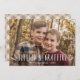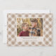 Rustic thanksgiving photo card featuring "Blessed and Grateful" displayed in white handwritten text adorned with wheat. Personalise the front of the cute Thanksgiving card by adding a photo, your names, and the year. The card reverses to displays a second photo and optional message with a watercolor plaid pattern in shades of brown and beige.