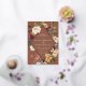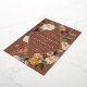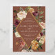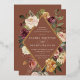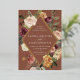 Elegant floral wedding invitations or fall or winter weddings feature your details nestled inside an elongated diamond surrounded by watercolor roses, mums and greenery in rustic autumn colours including peach, ivory, blush, burgundy and green on a rich terracotta rust background. Gold foil trim completes the design.