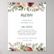 Charming autumn floral wedding menu sign displays your dinner selections in chic calligraphy and traditional block lettering, accented by watercolor flowers and botanical foliage.