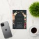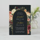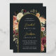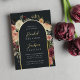 Elegant floral wedding invitations or fall or winter weddings feature your details framed by an arch of watercolor roses, mums and greenery in rustic autumn colours including peach, ivory, blush, burgundy and green, with sleek gold foil trim and gold calligraphy script lettering. A modern and elegant design for rustic chic weddings in the fall or winter months.