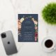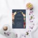 Elegant floral wedding invitations or fall or winter weddings feature your details framed by an arch of watercolor roses, mums and greenery in rustic autumn colours including peach, ivory, blush, burgundy and green, with sleek gold foil trim and gold calligraphy script lettering on a navy blue background. A modern and elegant design for rustic chic weddings in the fall or winter months.