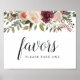 Designed to match our Rustic Bloom wedding collection, this elegant floral sign invites guests to take a favour. Personalise with two lines of custom text in calligraphy and block lettering (shown with "Favours; please take one"), framed by watercolor flowers and greenery in muted autumn hues.