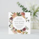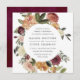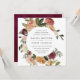 Our Rustic Bloom wedding invitation in a unique square format frames your wedding details with a circle of painted watercolor roses and mums in autumn shades of burgundy, marsala, blush pink and peach, with dark green foliage and leaves. An elegant choice for fall or winter weddings.