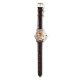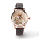 This adorable Rose Gold e Watch shown in brown leather, features a cute bird perched on a rustic wooden box surrounded by flowers on a beige gingham backdrop, creating a peaceful and natural scene. The bird adds a touch of life to the setting while the wooden box gives it a cozy feel. This watch is not just a timepiece but a lovely fashion accessory that has a farmhouse, rustic but modern style!