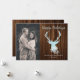 Stylish, rustic, flat holiday greeting card done in a dark wood grain look, on the right, and a custom photo on the left side. Graphics of an aquamarine deer head, with aqua glitter looking antlers, decorates the wood side of the card. Pretty white and aquamarine coloured snowflakes decorate the bottom of the deer. Personalise the text fields to suit your holiday needs.