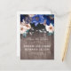 Navy and royal blue flowers, string lights and old wood barn style rustic save the date postcards