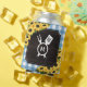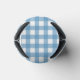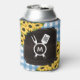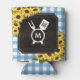 Rustic blue gingham baby-q can cooler with wood grain, sunflowers, and your monogram atop crossed bbq utensils.