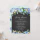 Invite guests to your event with this rustic blue floral baby shower invitation. It features watercolor illustrations of blue hydrangeas, roses and peonies, white roses, white anemones, greenery with faux chalkboard background. The colour palette of this hydrangeas floral invitation is perfect for spring and winter baby showers. Personalise by adding names, date, time, venue and other event details.