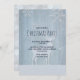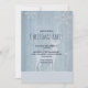 A christmas party invitation with a blue toned faux wood background. Layered over top is a silhouette of a reindeer with big antlers and some pretty snowflake illustrations falling down around him.