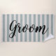 Simple stylish blue and ivory striped beach towel personalised with large Groom script lettering or customise it with your name or other text. Use the design tools to change the text fonts and colours or add your own photos to create a one of a kind personalised beach towel for your honeymoon or a unique wedding gift.