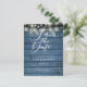 This rustic save the date card features string lights and an elegant script save the date above your details set in elegant typography on a blue rustic wood panels background. The reverse has additional save the date details, including your wedding website, with your return address and space for your recipient's address. Designed by Thisisnotme©