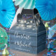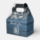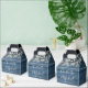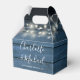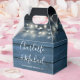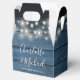 An elegant rustic wedding favour box featuring chic signature script names and special date on blue wood panels with pretty string lights. You can personalise with your own thank you message above two mason jars on the reverse. A perfect way to say thank you to your guests! Designed by Thisisnotme©