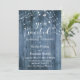 wood grain, country wedding, rustic wood invite, pretty twinkling light strands, blue and white wedding suite, trendy invitation design, beautiful script font, elegant typography, white text on blue, casual wedding style, country wedding style, barn wood, warm design elements, high contrast, rustic wedding invitation with sparkling light accents, white lights over rustic rich blue wood wall