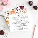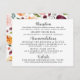 Wedding information cards include reception, accommodations for two hotels, and wedding website information. The back of the card features a floral pattern of beautiful watercolor flowers, including summer and fall roses, dahlias, peony flowers, and greenery, in a gorgeous autumn palette of burgundy red, golden yellow, peach orange, blush pink, and shades of green.