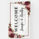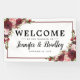 Elegant rustic wedding welcome banner featuring a plain white background that can be changed to any colour, a burgundy thin border, an array of marsala red, burgundy & blush pink watercolor floral flowers, and a stylish wedding sign template that is easy to personalise.