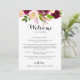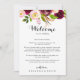 This rustic blush burgundy wedding welcome letter is perfect for a simple wedding. The design features pink, blush, red, burgundy and bordo watercolor flowers with green foliage. Personalise the front with a welcome message for your guests and your names. Personalise the back with the schedule of events and other useful info.