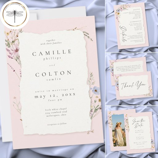 This blush floral wedding invitation features a soft pastel background, delicate wildflowers, and a handmade torn edge paper look. Perfect for romantic garden weddings, it offers an elegant, modern style with timeless charm for couples seeking a refined wedding design. Created by Simply Farmhouse Press.