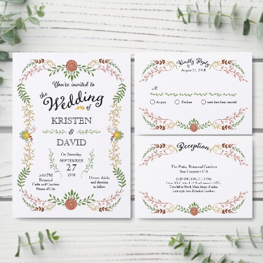 This rustic boho wedding invitation suite features hand-drawn autumn-hued foliage strung together to form a wreath. Modern calligraphy accents provide an elegant touch.