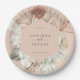 Beautiful rustic boho-chic dried palm fronds, roses and orchid geometric frame on pink sand colour background, personalised paper plates. Designed to match our Bohemian Oasis Wedding Collection.