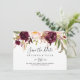 This rustic boho colourful floral horizontal wedding save the date is perfect for a modern wedding. The design features pink, purple, red, and burgundy watercolor peonies clustered into elegant bouquets with green foliage, inspiring natural beauty.