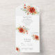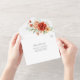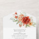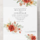 An elegant wedding invitation set featuring watercolor florals in rustic beige, burnt orange, sienna tones on a brown background.